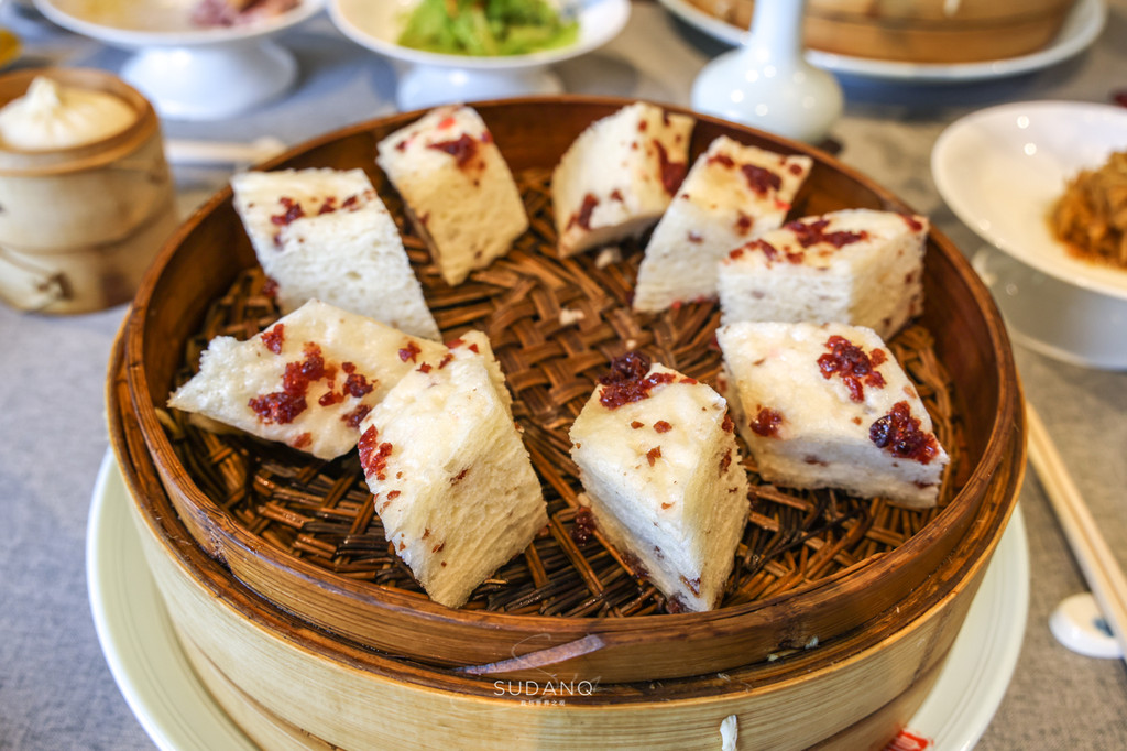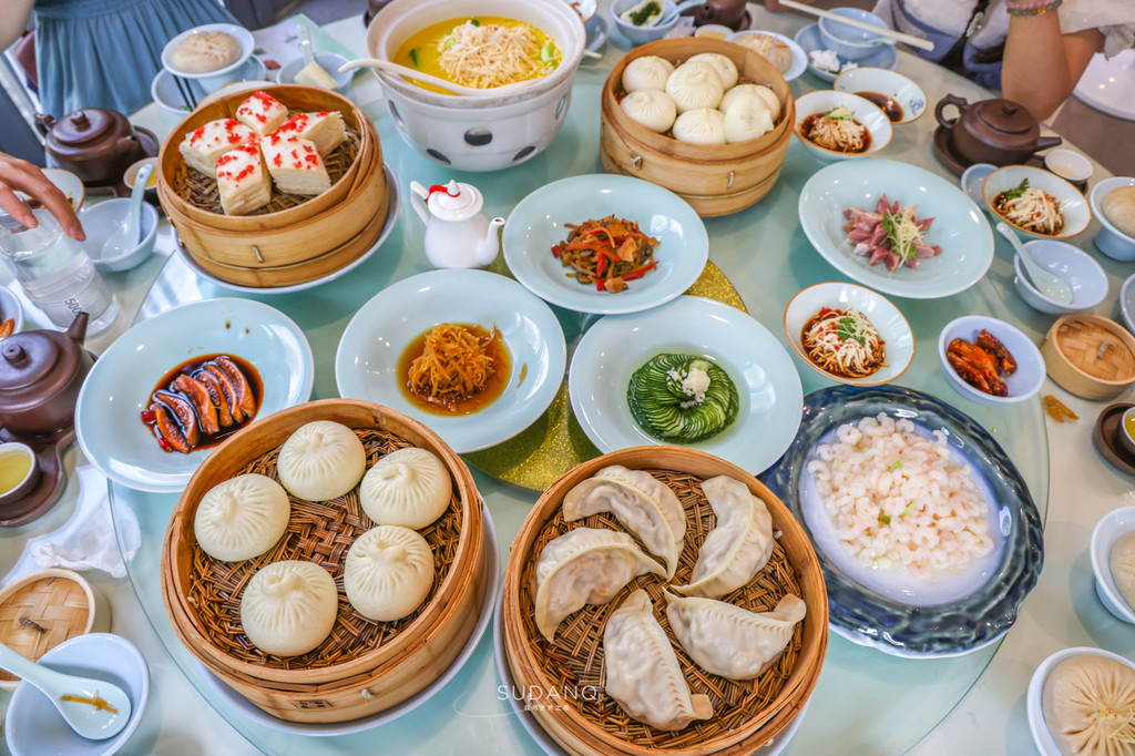 早茶必点:烫干丝、翡翠烧卖、蟹黄包、三丁包、五丁包、银丝面、虾籽饺面等。