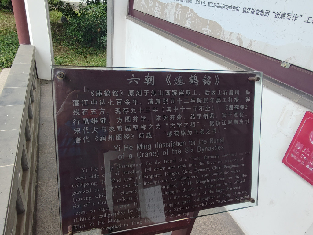 相传《瘗鹤铭》为东晋大书法家王羲之所书,他平生极爱养鹤。在他家门前有一“鹅池”,他常以池水洗笔,以鹅的优美舞姿丰富他的书法,故而他的字有“飘若浮云,矫若惊龙”之称。一日他到焦山游览,带来两只仙鹤,不料两只仙鹤却不幸夭折在焦山。王羲之十分悲伤,用黄绫裹了仙鹤埋在焦山的后山,遂在山岩上挥笔写下了著名的《瘗鹤铭》以示悼念。因其书法绝妙,当即被镌刻在山西岩石上。后因岩石崩裂,坠入江中,长期受江水的冲击,风雨的侵蚀,以及不断被人凿取,到清朝康熙五十一年(1712),才由镇江知府陈鹏年派人从江中捞起无块原石,仅存下八十六个字,其中不全的有九个,但仍可见字体潇洒苍劲,别具一格,书法价值极高,确有稀世珍品。宋代著名书法家黄庭坚认为,大字无过《瘗鹤铭》,推此为“大字之祖”,曹士冕则认为“焦山《瘗鹤铭》笔法之妙,为书法冠冕”。《瘗鹤铭》碑之所以为古时书法家所推崇,是因为它是隶书发展成楷书的演变过程中著名石刻之一,也是我们今天研究书法发展史的重要实物资料。