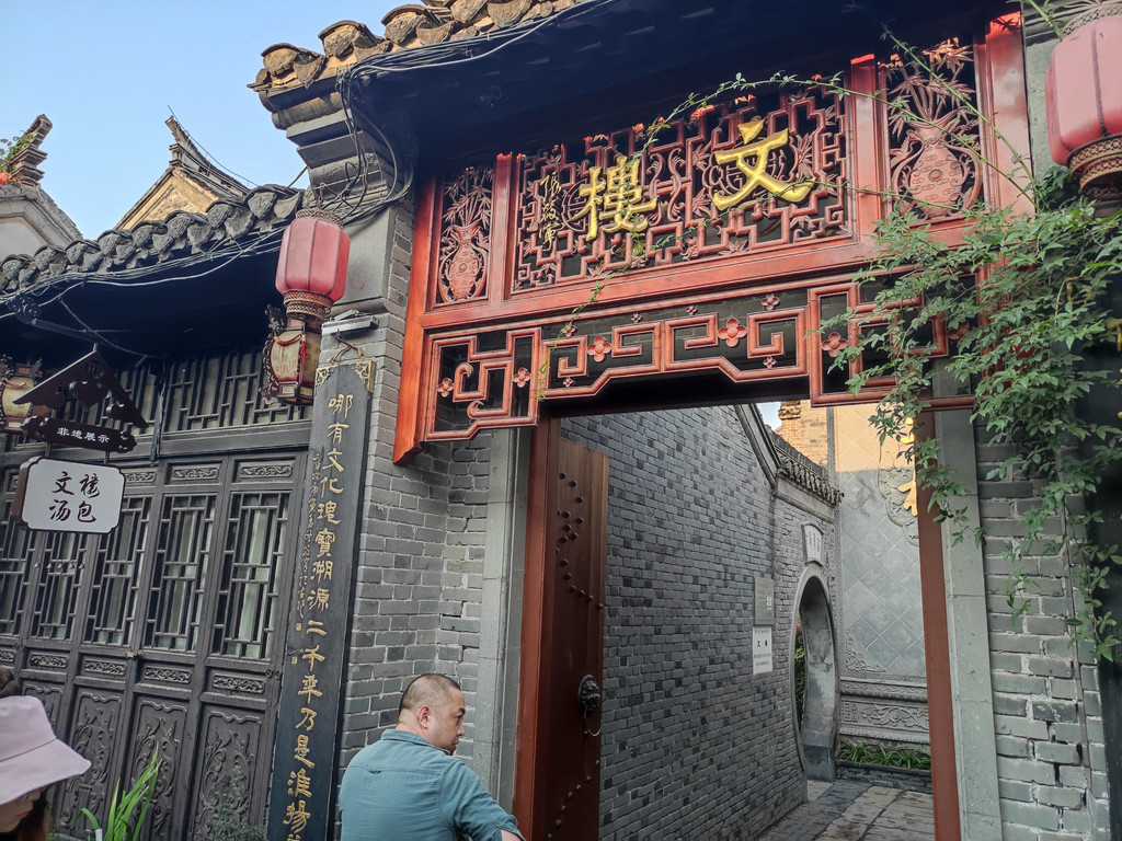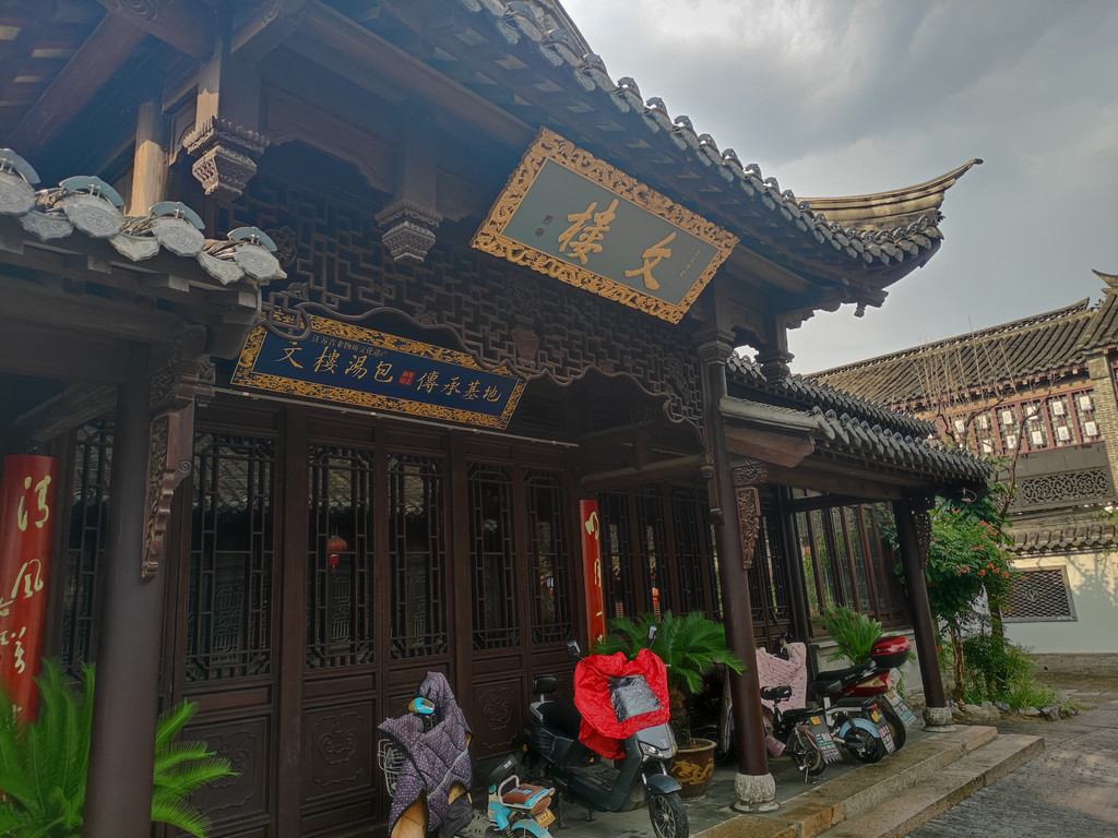 河下古镇是楚州老城保存最完好的历史街区,其历史可以追溯至2500年以上。吴王夫差开凿沟渠涵沟。在河下漠口与淮河相接,以利于向北方运送军队和粮草。它是一座活着的古镇,除了体现淮安特色美食,还有奶茶店、咖啡店。甚至是艺术馆,既有朴素的生活,也有遥远的梦想。路边的居民正在剥新鲜的菠菜,炸肉圆儿与茶伞的香味儿随风飘到远处。小摊前的千层底鞋,一秒让人拉回过去的时旧时光,满满的是烟火气。悠闲地走在古镇来到“文楼”这座是文楼在古镇新建的一个餐馆,接着走石板路要到有院落的文楼去品尝灌汤包。最便宜的一个三十元。顺便在文楼点两个菜,一碗米饭解决晚饭。