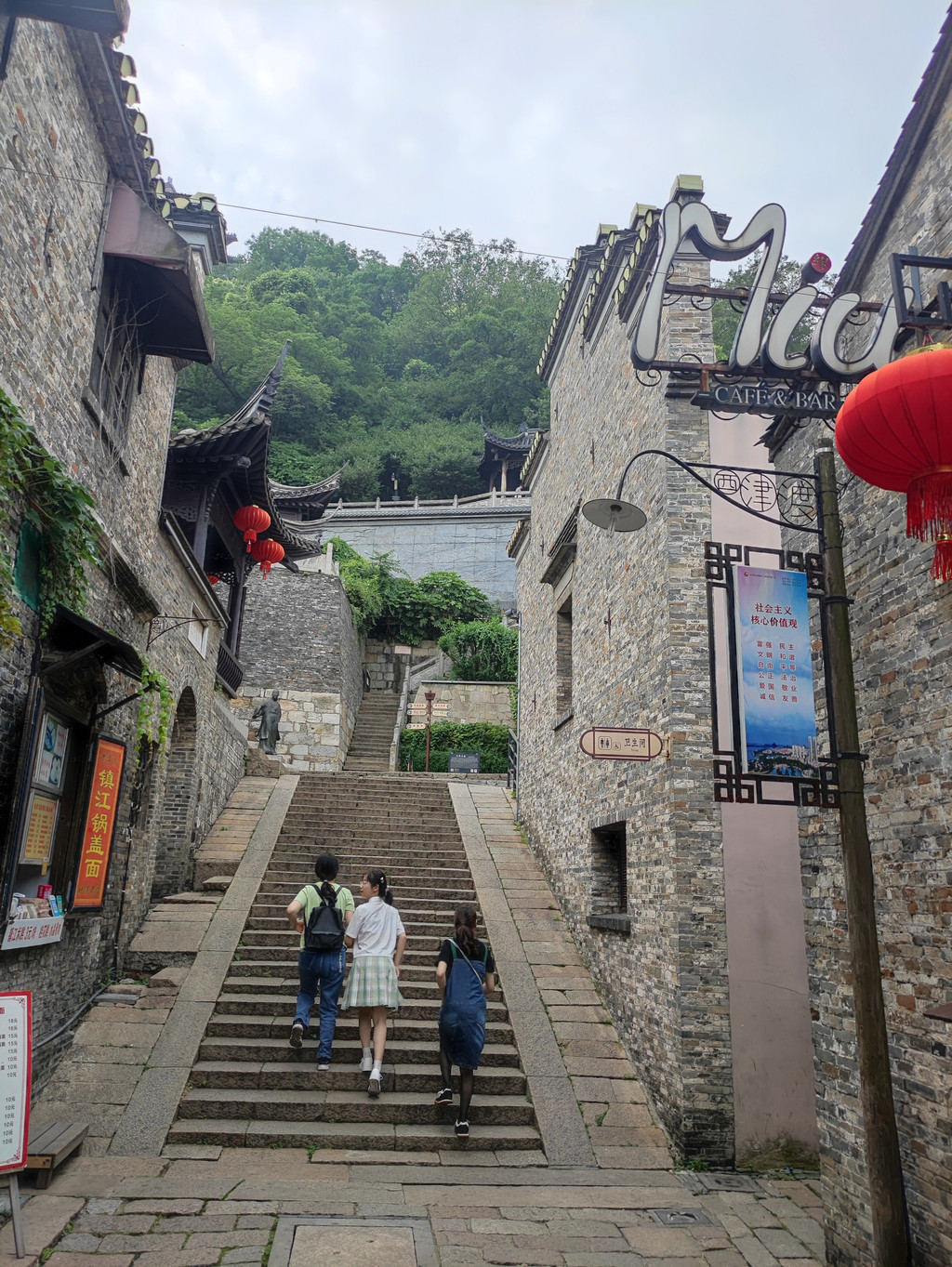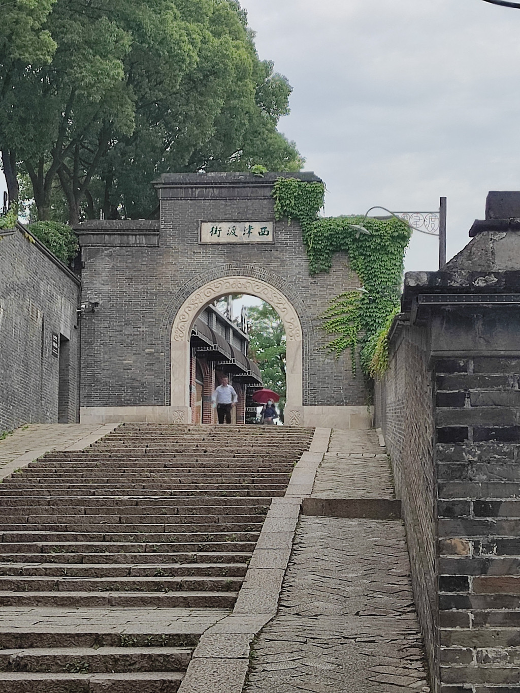 我是从文宗阁的金山公园出口出来的。用导航一看,距离西津渡不太远,溜达过去,西津渡古街不仅有着古色古香的街巷,他是镇江文物古迹保存最多、最集中、最完好的地区。古街上的建筑多为明清时期的风格,砖木结构、飞檐雕花。满街都是鳞次栉比的两层小楼。深深的车辙压过青石板路,千年古街的风韵犹存。
