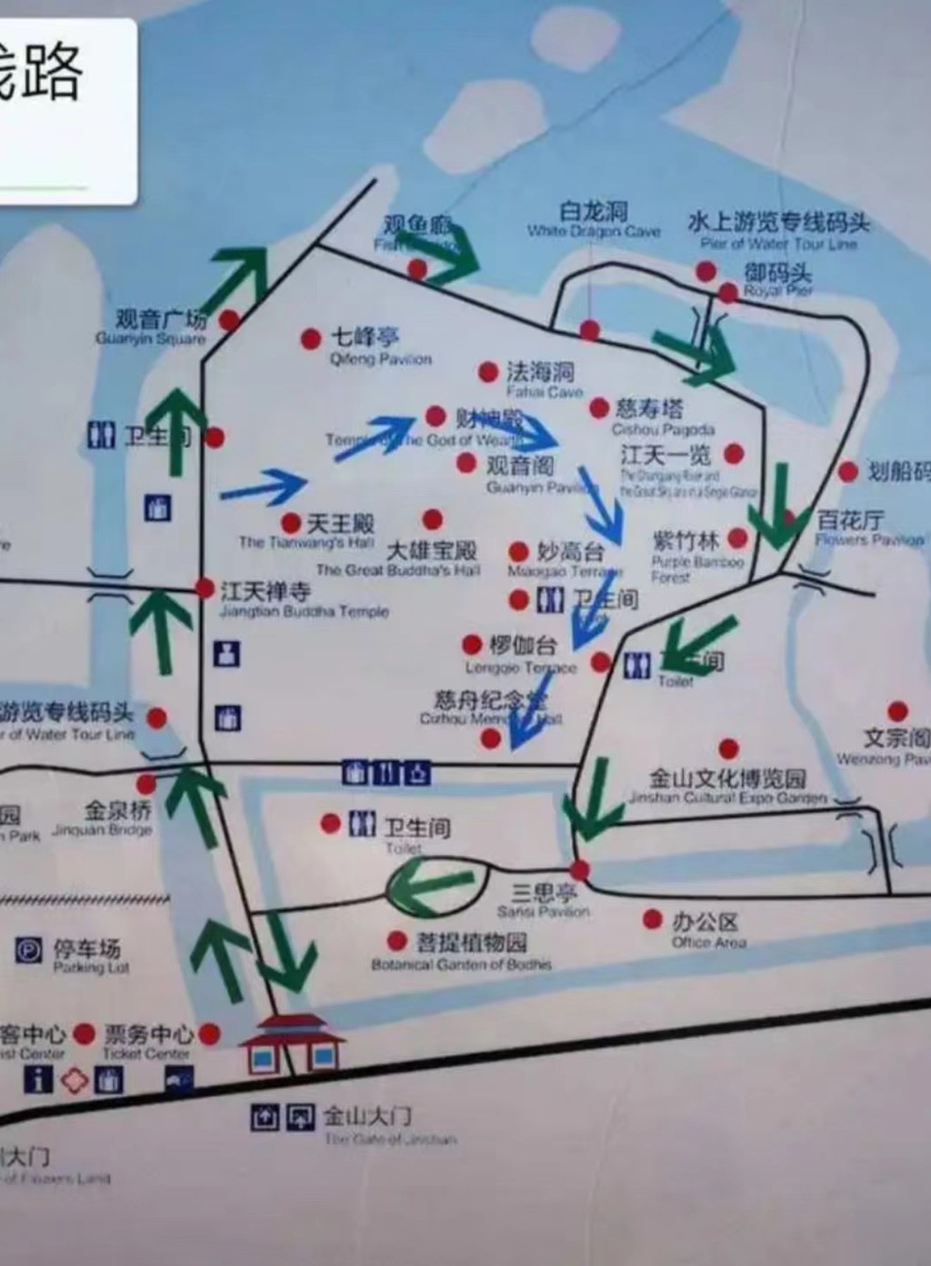 好景区就是要会说故事,金山寺就是典故云集的好地方:佛印和苏东坡赌玉带,西游记中唐僧的出家之地、法海禅师的苦修之处——法海古洞、神话故事-水漫金山、白蛇传的传说......而故事中的“金山”,传说便是镇江的金山。其基本游缆线路:江天禅寺→夕阳阁→观音阁→楞伽台→佛印山房→金山四宝→慈寿塔(维修)→古法海洞→留云亭→妙高台→七峰亭→白龙洞→朝阳洞→古仙人洞→玉带桥→御码头→郭噗墓→天下第一泉(维修)→芙蓉楼(维修)金山寺巧妙地依山而建,富有独特的建筑风格,殿宇后堂幢幢相衔,亭台楼阁层层相接,从山脚到山顶,一层层殿阁、一座座楼台,把山体严严实实地包裹起来,远观近观只见金碧辉煌的寺塔而不见山体,形成“寺裹山”的独特风貌。