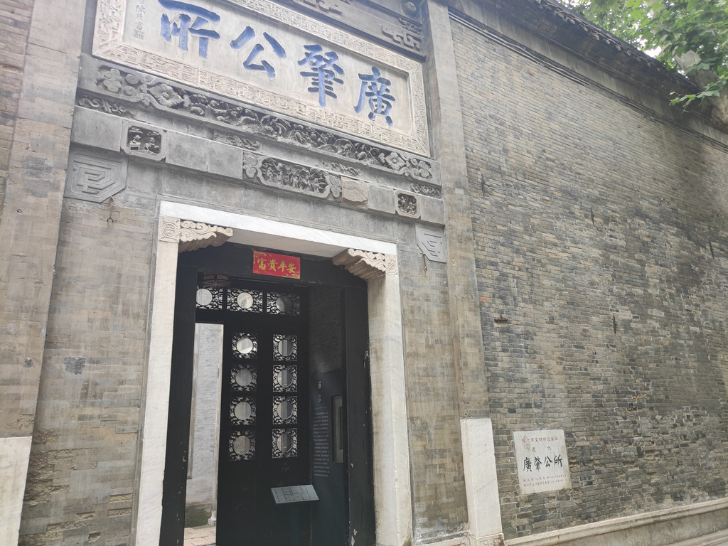 位于伯先路 82号,坐东朝西。有厅房、正房、偏房、厢房二十多间,占地近600平方米 ,围墙高筑,庭院深深。正面门楼的石横额上刻有“广肇公所”四个字,是前护川督陈 燏 书,大门设罩,雕琢精细,有福、禄、寿三星及渔、樵、耕、读、琴、棋、书、画等习俗装饰,为传统的古建筑风格。门在内厅向西,厅前南侧厢房中有“广肇公所记”壁碑一方,记述了广肇公所的由来及重建始末。现正厅已毁,余皆尚存。广肇公所的名称是因为此建筑是由广州、肇庆两府旅镇客商合力兴建,为两府商人聚会及洽谈业务所在。原址在运粮河旁,现址是清光绪三十三年( 1907 )由卓翼堂主持重建。民国初年,孙中山辞去临时大总统后,从上海至南京途径镇江,曾在公所住宿一夜,在此召见各界人士,发表演讲。我只游览广肇公所旧址其他的没去看,据说都关闭着。