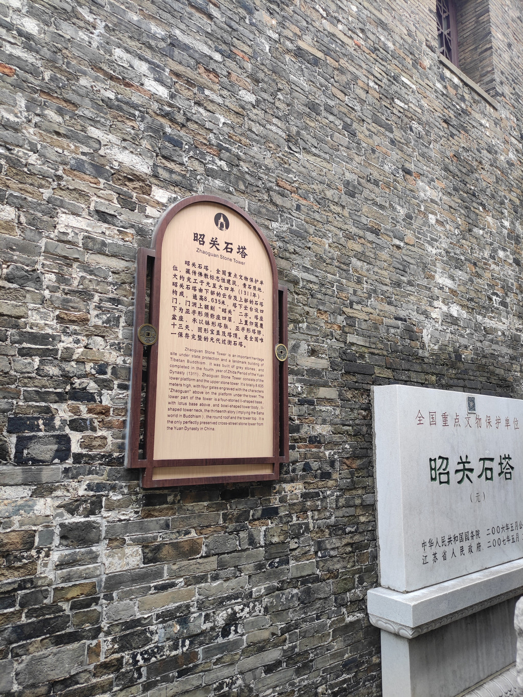 引人注目的则是立于古街之上的一座过街石塔,白色的喇嘛塔矗立于通道的上方,让人顿生敬畏之感,塔基之下有修葺纪念碑,上书“西津渡过街塔又称昭关石塔、观音洞喇嘛塔、瓶塔,系元武宗海山皇帝命画塑元大都白塔寺工匠刘高仿京刹梵相而作的金山般若禅院的一部分。竣工于元至大四年(公元1311年)或稍前”。由此可见这一建于元代的过街塔至今已经历过600多年的风雨沧桑,且与北京老城中的白塔寺还有着嫡亲渊源。此塔为江南独一无二,全国亦不多见。