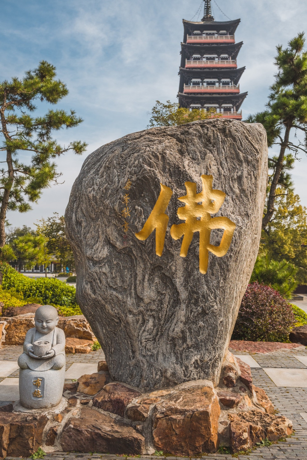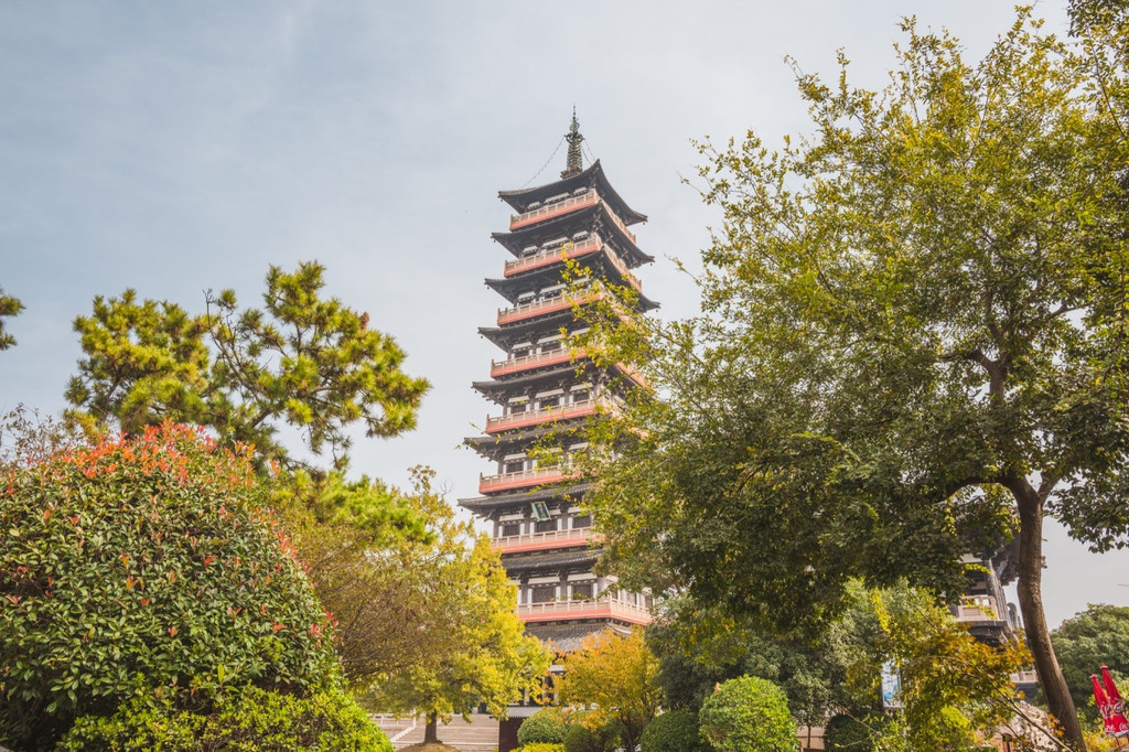 栖灵塔最早建于隋文帝仁寿元年(公元601), 塔高九层,塔内供奉佛骨,谓之佛祖即在此处。所以叫做“栖灵塔”。可惜在唐武宗 会昌 三年(公元843)一代胜迹化为焦土。1980年,鉴真大师塑像回扬“探亲”,谷界人士倡议重建栖灵塔。我们现在所见的这座是1995年建成的,虽然是 新建 ,但也是依照文献资料,仿造唐代佛塔所建。宝塔每层四角的飞檐下,皆垂有风铃,清风吹来,叮当作响,与塔内传出的梵音浑为一体。