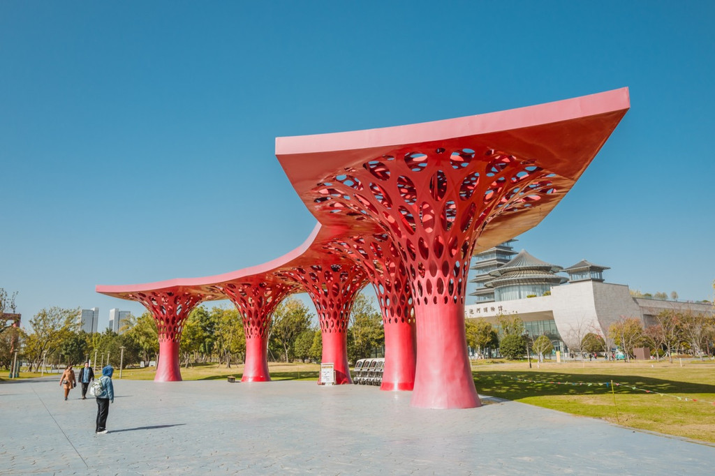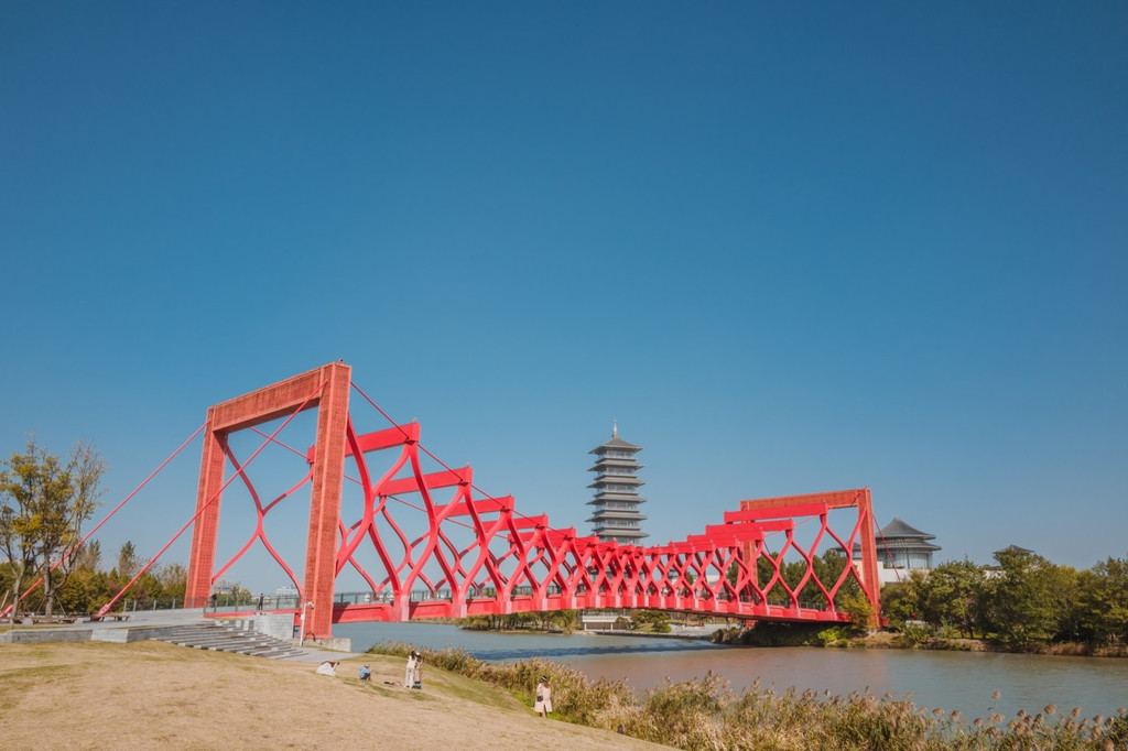 剪影桥以 扬州 民间剪纸和拉花为灵感, 中国 红色调在蓝天白云下超上镜!设计独特有韵味,造型灵动优雅,成为 扬州 的新地标。