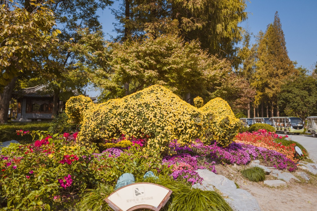 3⃣️在玲珑花界、 罗城 花园、五亭桥等区域布置各种造型艺菊
