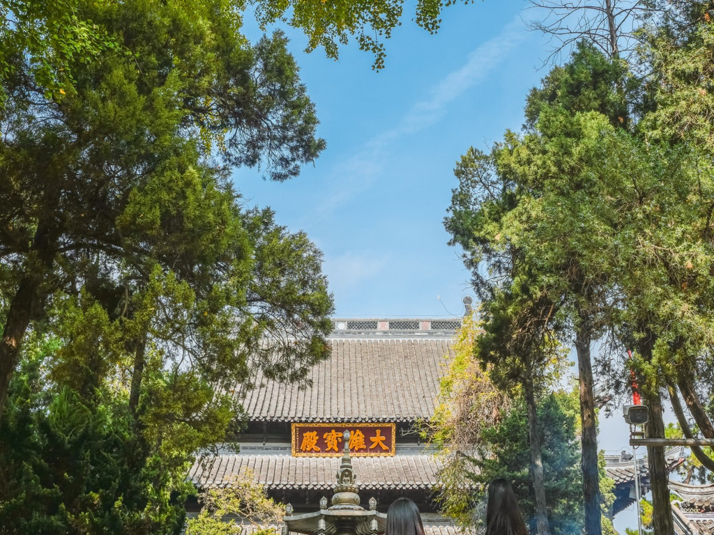一进门就是最主要的大雄宝殿是大明寺最主要的殿堂,体型雄伟,气势恢弘。 屋顶为三重檐歇山顶,灰瓦屋面,漏空花脊。屋脊高处嵌宝镜一面,迎面嵌砖刻“风调雨顺”四字,背面嵌砖刻“国泰民安”四字。此说出自佛家,意为大雄宝殿与天王殿诸佛诸神,肩担保护人间国泰民安、风调雨顺的重任。