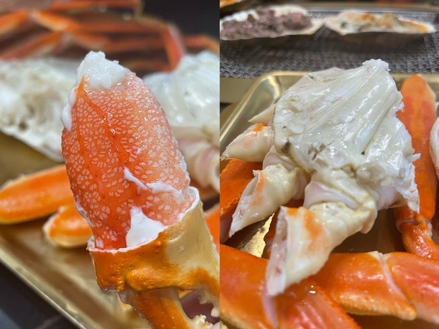 我们想点帝王蟹的,店家就三个。称了下分量5斤多点,大概1200元左右,但是我们三个人是吃不掉的,就选了板蟹,298元一斤,一只蟹3斤不到,556元。(这个蟹我们还没全部吃完呢,蟹黄拌饭几乎没动)