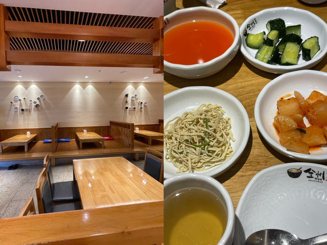店里一半是韩式榻榻米的座位,需要拖鞋入座。我们还是座板凳上咯!一入座服务员阿姨就端来热茶和韩国泡菜,看着泡菜量好少呀,阿姨说吃完会给加,不浪费就好!