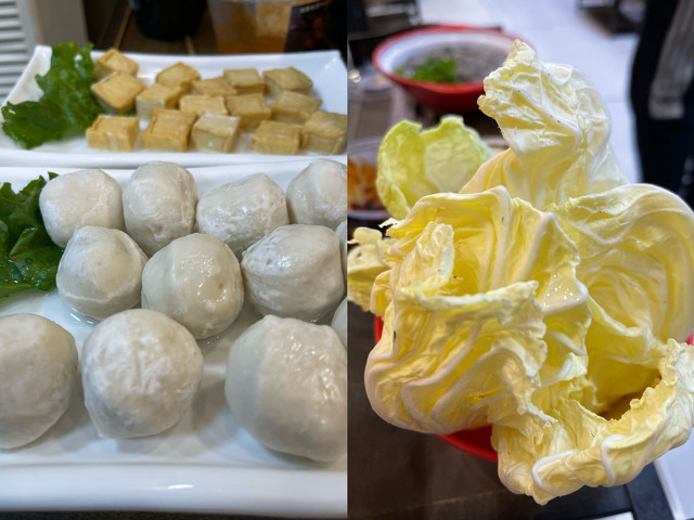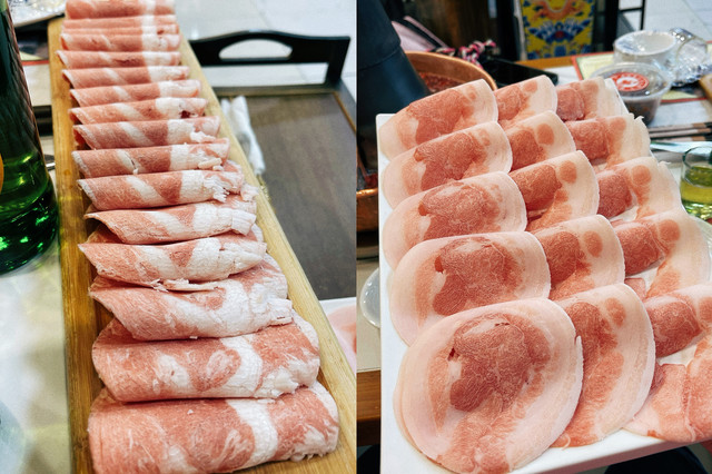 点了两盆肉,分别是科尔沁羔羊卷和手卷五花肉。我看隔壁的几桌几乎也是点这两种肉的,应该是必点的。再来1个酸菜1个大白菜;一份招牌的爆肚;招牌的爆汁牛丸和一份特价3元的鱼豆腐。