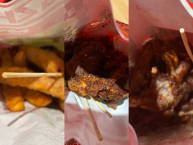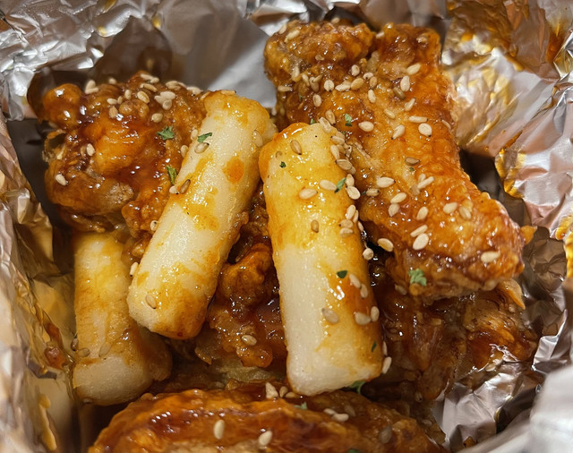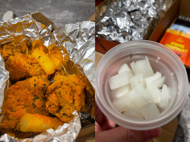 快乐水+芝士脆皮味炸鸡+琥珀甜辣翅根无骨拼。甜的炸鸡和咸的炸鸡都点到了,还有炸鸡搭配的解腻酸甜萝卜。