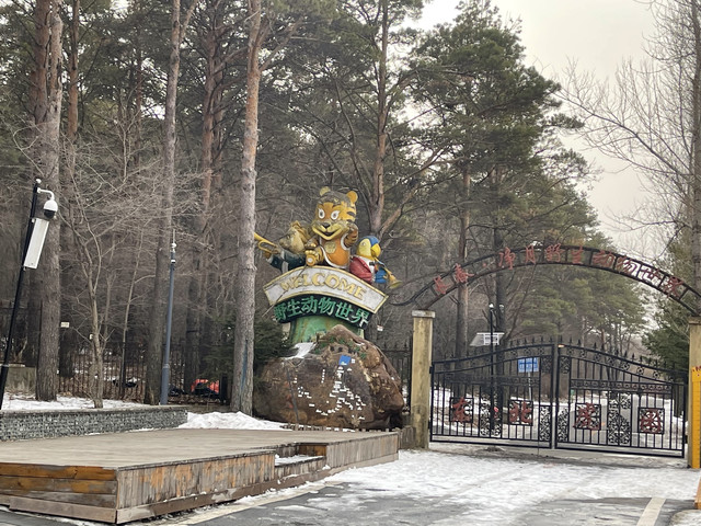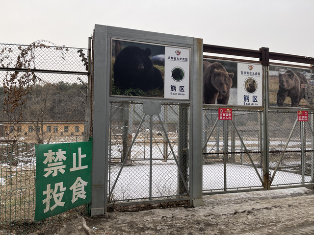 收票入园先看到的猛兽区,放养着熊和东北虎,春秋季是可以坐铁龙车进入活动区域观察和喂养他们,冬天应该是淡季所以没有这个服务,他们离我们的视野很远,隔着3层厚厚的铁笼和电网,只能远远的看着他们。