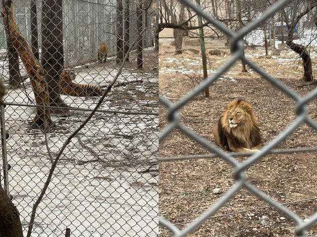 然后是一个大型的露天舞台,不过大雪覆盖着舞台,走路很费劲。在这里意外看到了圈养的老虎与狮子夫妻档。还有2只中年的老虎。大家很稀奇的看着老虎,老虎也很友好,对着我们晒肚皮睡觉,跟猫似的。