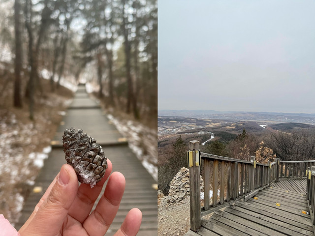 大冷天的帽儿山显得还是比较荒凉的。所有的树木都在过冬。木质的路有点年头了,有些木头都有点儿腐烂,走路也要小心。部分的楼梯应为有冰块结冰,走路要慢慢的。沿途捡了松果,慢慢的呼吸清新的口气,有的路有栏杆,有的路没有栏杆,走的时候还是要小心点的。