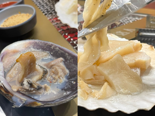 店家帮我们把扇贝,生蚝和天鹅贝洗干净端上来。服务员帮我们放在炭火上面烤。大扇贝的个头真心好大,瑶柱肉个头也好大,还需要用剪刀剪开来便于烤熟。建议不要加辣椒酱,原味的更好吃。天鹅贝烤出来的汤好鲜哦!