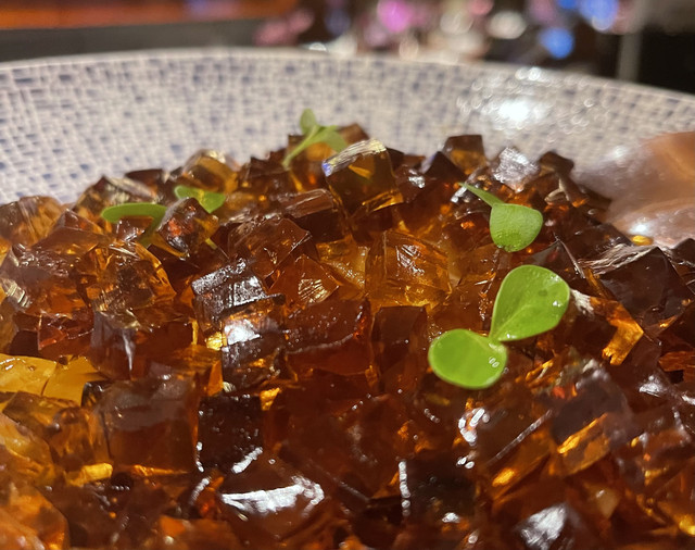 冷菜啫喱脆蛰我好喜欢呀。啫喱是用醋汁做成的透明果冻状,吃起来凉凉的,酸中带甜,非常的开胃。啫喱下深埋着海蜇裙边,浸在醋汁里也有点微微酸味,咬起来是脆脆的。超级好吃呀!喜欢!