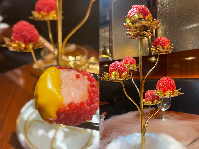 荔枝虾球是一道感官形式的菜肴。在很多餐厅都看到过,算是一道创意菜。把虾打成虾胶状做成虾球。上桌后还要倒入干冰营造仙气飘飘的感觉。是店家每桌都点的一道菜。它一定要趁热吃。蘸芥末色拉酱味道更佳!