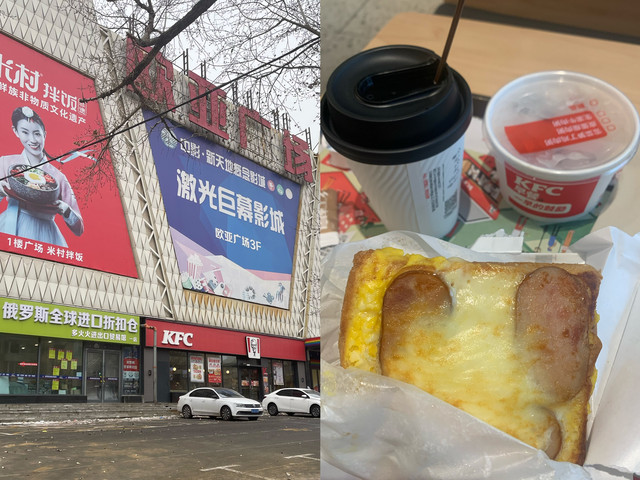 肯德基的早餐团购:一杯热咖啡+乳酪云朵火腿吐司+皮蛋瘦肉粥,总共话费23元。咖啡实在太烫,倒在自带的保温杯里带着去滑雪场了。