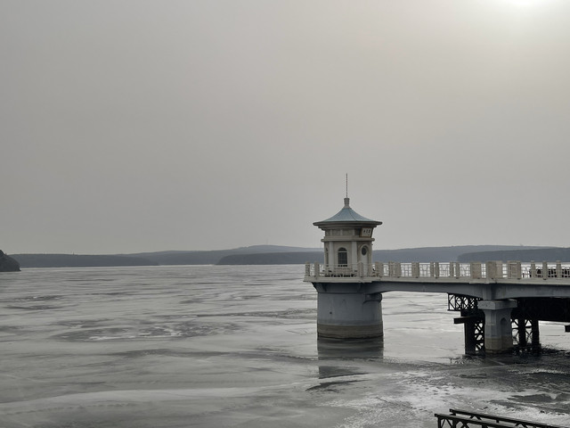 车子上会有语音播报。车子行驶过的景点都会有详细的介绍和注意事项的提醒等。主要行驶路线就是围绕净月潭这个湖水一圈来行走的。山路还是挺绕的。第一站就是坝西站(冬天也在维护中)美美的灯塔和走廊都锁着不能进入拍照。加上天气也不太好,阴天拍出来就是冷飕飕的既视感啊!