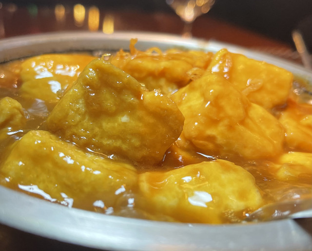 瑶柱鲍汁豆腐也是一道地道的粤菜。烧制滚烫的石锅里放着冒泡的豆腐。扑鼻的瑶柱汁的香味,拌饭吃是一绝。是小孩子吃饭下饭的好菜。