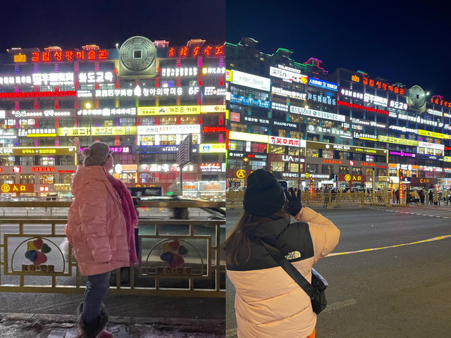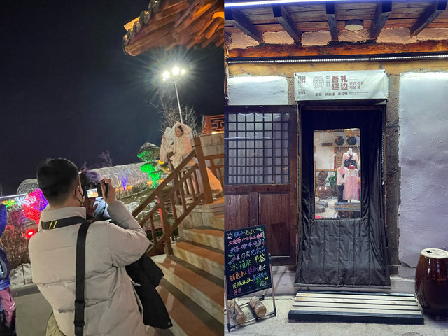 说实话,晚上的民俗园拍照没有白天好看。虽然摄影师带了打光灯。民俗园里到处都是朝鲜公主,室内的朝鲜房屋背景挤满了拍照的公主们,我还是室外拍拍算了。室外也是排队凹造型,都是一个板子。没什么心意。感觉还是应该小伙伴之间相互拍照比较容易出片,带个会拍照的小伙伴比摄影师靠谱哦!