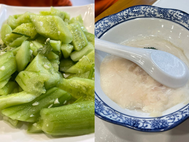 酒过三巡,老板送来拍黄瓜和鱼滑,说是免费送的。哈哈,本来就想点8元钱的黄瓜的怕吃不下就放弃,没想到还是吃到了,好开心呀!鱼滑的味道比较一般,吃口普通。