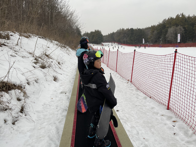 小伙伴他们是心心念念来滑单板的。滑单板的鞋子要比自己本身的大一个码。雪地的第一个坡道是给当地青少年滑雪营地用的,需要走到坡度的地方去。