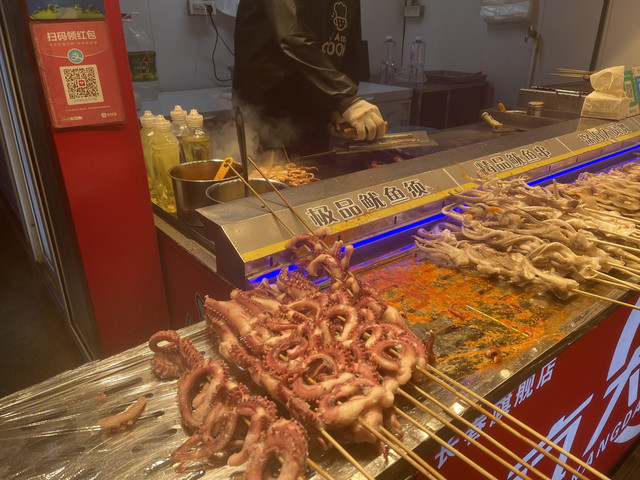 我们误打误撞的走到了宵夜一条街,桂林路。乖乖,大冬天的这条马路这么热闹。霓虹灯绚烂,快递小哥来来往往。走到一半路上看到铁板大鱿鱼摊位。被吸引了,蹲在马路牙子上啃15元一大串鱿鱼,啃起来很解气。