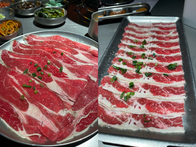 三份肉分别是肥牛,猪排肉和牛肉。都是好嫩的肉哦,感觉牛排肉腌制的最好吃。店里生意好的来不得了,服务员都忙不过来,所以上水,上调料,上生菜,打包都好费劲。