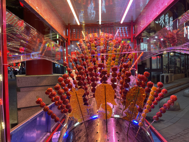 火锅店所在的区域好像靠近桂林路美食街附近,附近挺热闹的。一下车就看到一排店铺,不过第一个吸眼球的是卖糖葫芦的小摊贩。这里的糖葫芦比上海的便宜一半价格哦。小伙伴的儿子吵着要吃一串,买了,大大的一串草莓18元,足足有6个。