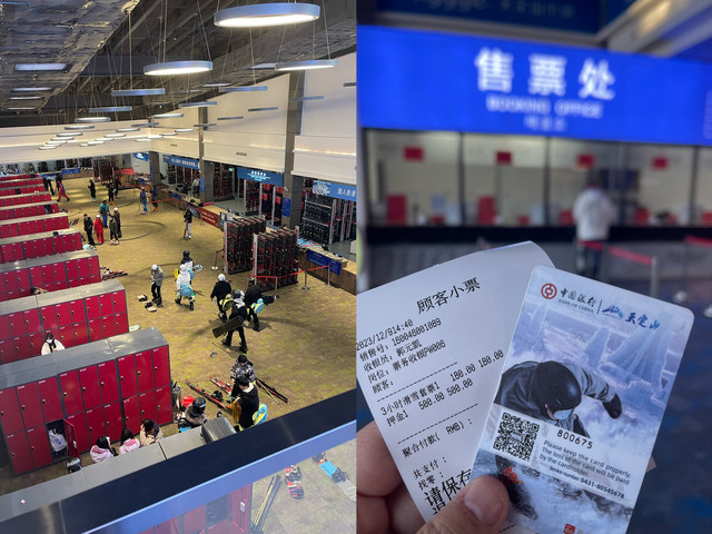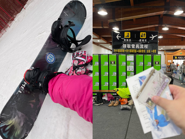 滑雪场16点关闭,倒推3小时就是13点要进雪场。但是我们还是迟到了,13:30才到滑雪大厅换了雪卡。拿到雪卡以后先去拿滑雪鞋,然后去拿滑雪板。如果要租头盔和护具在休息大厅里可以找工作人员租,40元/件,押金2000元。私人用品是免费租用柜子的,租用的时候有押金15元,结束租赁后记得在公众号提现出押金,不会自动退还。