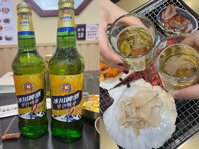 由于是工作日的中午,客人不是很多,所以给了我们一个六人的包房。入座选好海鲜后服务员就是处理了。我们点了延吉的啤酒坐等炭火端上来。