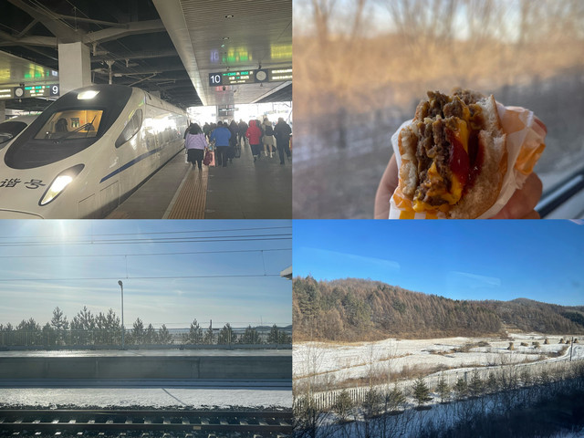 始发站的高铁车厢几乎是坐满的,但是到终点站下车的车厢人数才不到五分之一。上火车前在高铁站买了麦当劳早餐,在车厢上吃,沿途看着被雪覆盖的田地,和坐车路过江浙沪看到不一样的窗外风景。