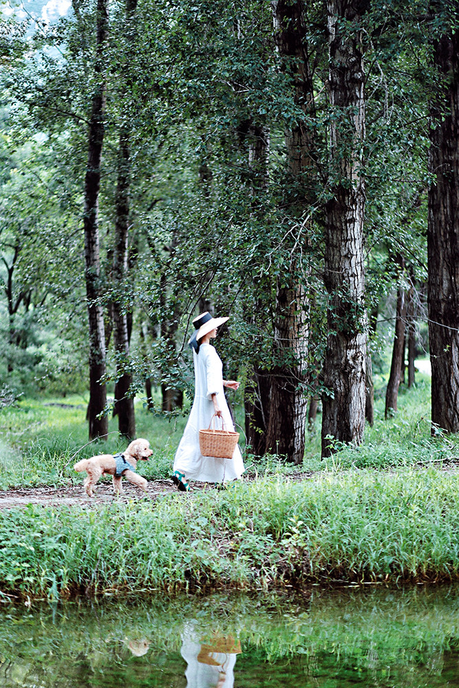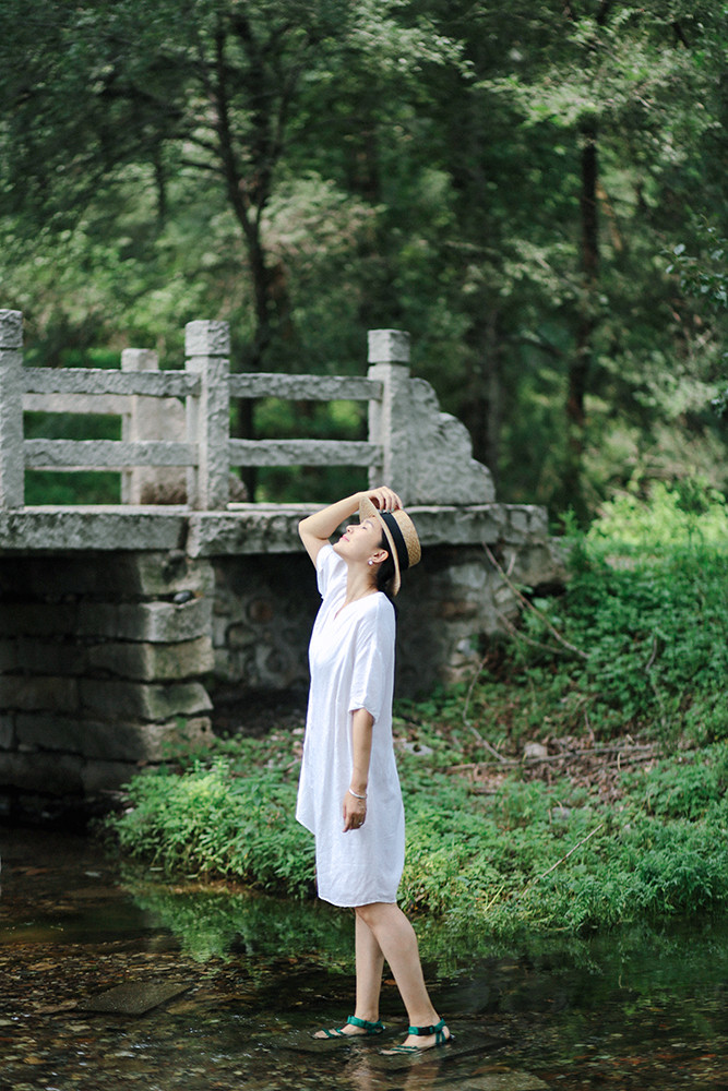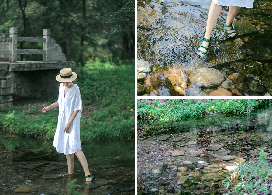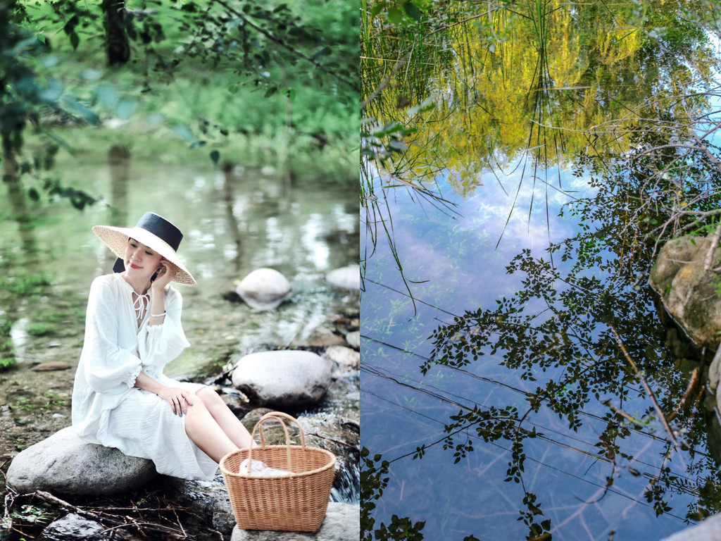 因为森林都是养眼的绿色基调,服装选择森系的白色长裙和过膝短裙都可以,长裙配法式大帽檐草帽,立刻有了法式乡村风,还能有效防蚊虫。过膝麻质短裙则很方便下水玩耍,搭配户外沙滩鞋,在水中和徒步也都非常安全。搭配草帽,整个画风都很舒服。