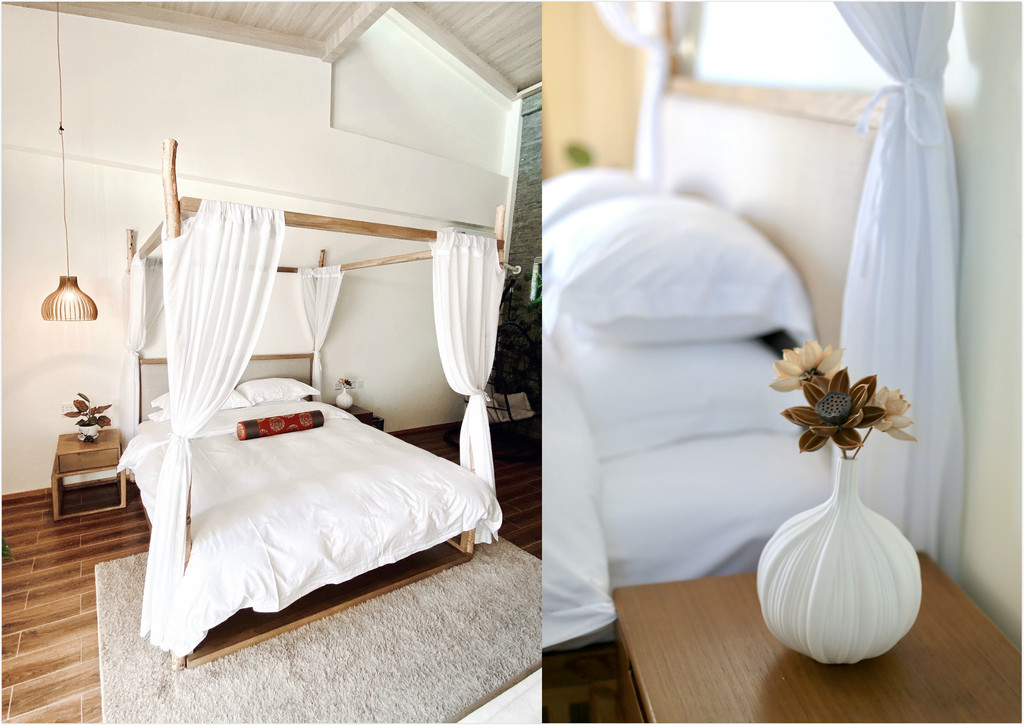 卧室后面还有一个种满植物的静谧小院,与山水为邻,望满山染绿,好不自在。