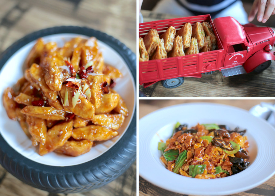 装菜的餐具也是颇有新意,酷酷的卡车装的肉饼,脆香可口,轮胎盘子装菜的溜茄子,别出心裁,让人胃口大开。