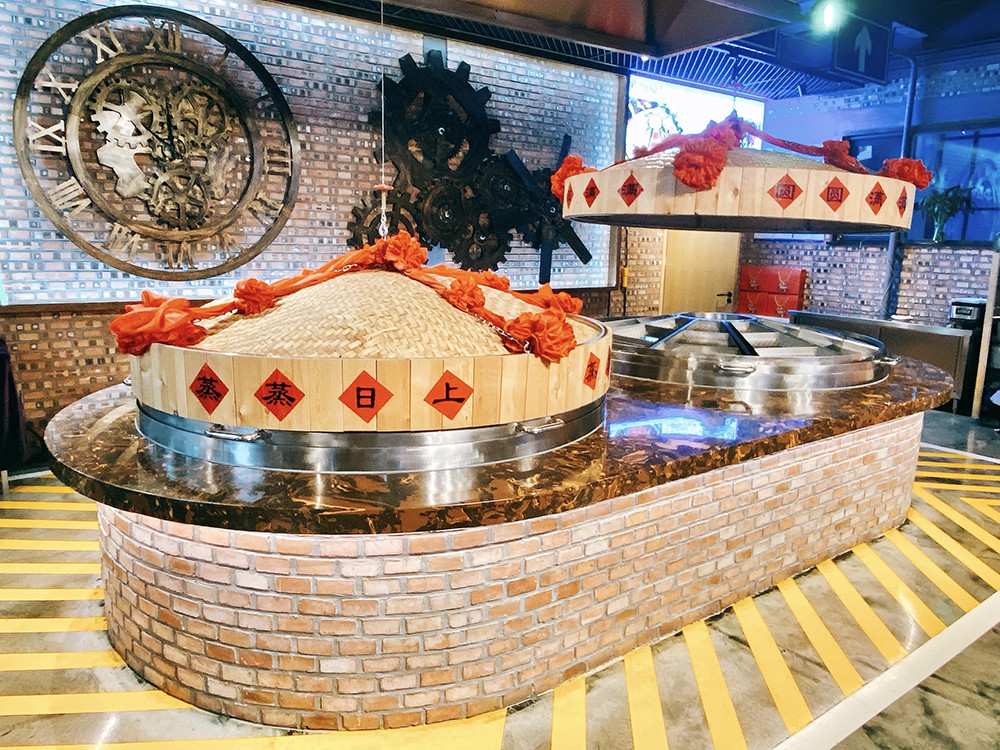 自游自在美食最大特色就是这个“瓦特养生蒸锅宴”啦!两个超级大蒸锅,可同时制作百人特色养生蒸宴。