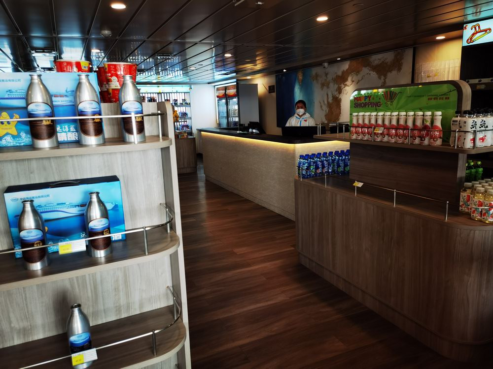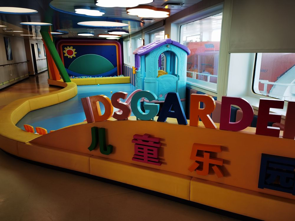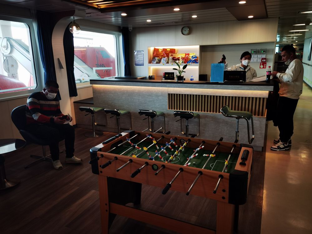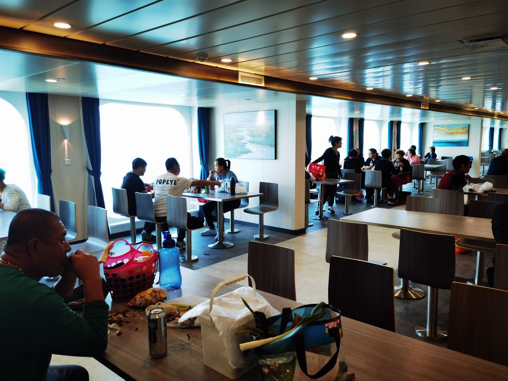 吉龙岛轮配备了360多间客舱,可承载1375名旅客,并设有餐厅、超市、电影院、儿童乐园、酒吧、健身房、天幕甲板等服务设施,豪华程度不亚于邮轮,能满足旅客不同层次的需求,为旅客提供舒适的乘船体验。图为吉龙岛号客滚船的游客服务大厅。