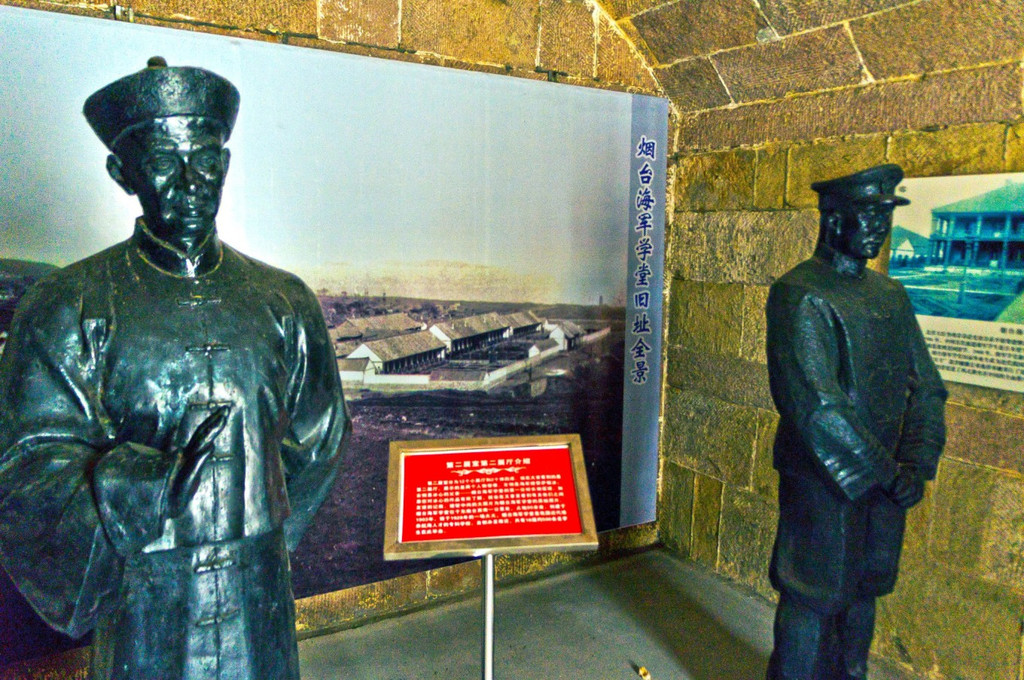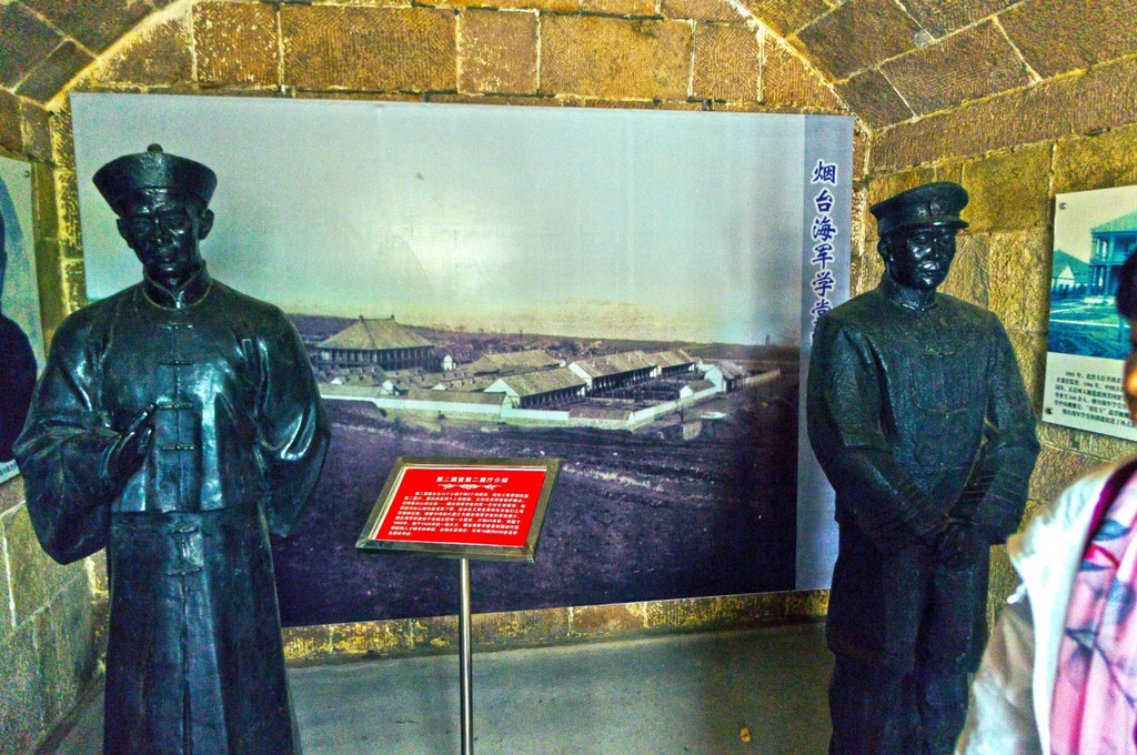 两座塑像是担任过清朝海军统制(总司令)萨镇冰和 烟台 海军学堂校长谢葆璋。