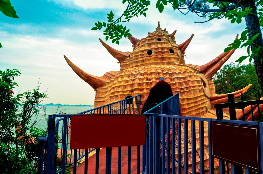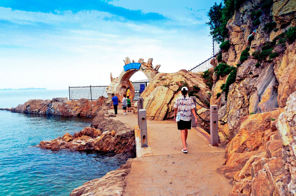 蜒起伏的环海栈道像条玉带围绕着东炮台的北面海滨别致的小亭、弯月型的吊桥、海螺状的塔楼就像飘带上缀满的明珠。漫步东炮台,每一处景点都闪耀着迷人的光环,每一个景色都抒散着大海的豪情。山光、海色、人文、遗址完美地结合在一起,