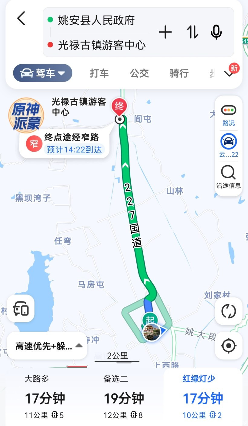 从姚安县城出发,有两条主路可选择,图中为一条,另一条前几年修通的,是从县城直线到达古镇。