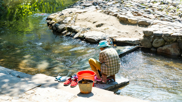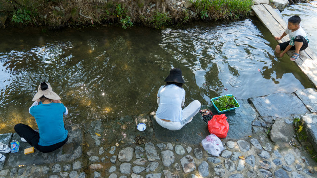 瑶河穿流而过,村民们洗洗涮涮就在门前河边。一个脸盆,一个锤子,又见南方农村传统凿凿捶捶洗衣法。