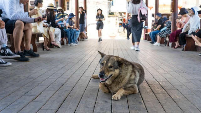 古镇上有座廊桥,游客走累了热了来此休息,里面有木凳可坐。一只狗狗旁若无人在人群中撒欢,任凭游客来来往往。