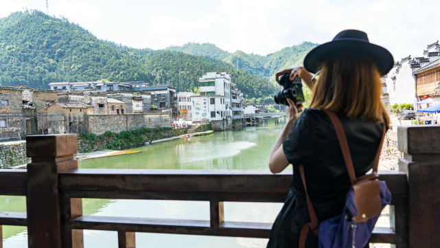 站在桥上远眺古镇,山峦绿意葱葱,植被茂密,河水浸染成绿色;山下飞檐翘角,粉墙黛瓦,总让人想起影视剧中的情节。