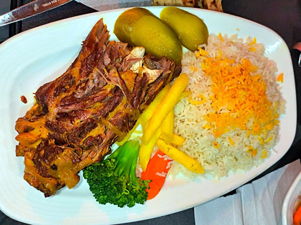 伊朗时间20:00,当日经过个把小时的休整,大家在余粟的带领下,从下榻的亚兹德萨法伊酒店驱车来到当地著名的洞穴特色餐厅品尝羊脖晚宴。