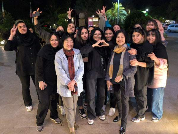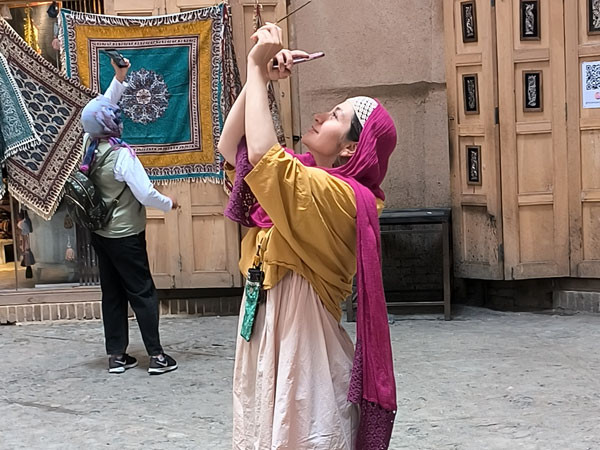 伊朗人的热情真是无处不在,当晚结束从洞穴餐厅返回下榻的酒店,刚到门口正好碰上一群从酒店里出来的年轻女子,她们看见了我们后立刻高兴地招呼道:你好!你好!并友好地邀请一起合张影。于是我赶忙拿出手机留下了这美好的瞬间。此情此景,记者深感此次的亚兹德的行程一定会十分美好。