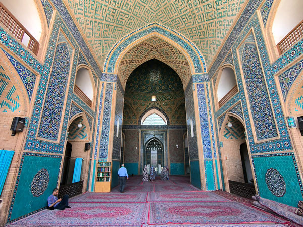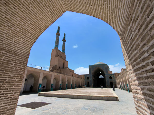 这座至今仍在使用的清真寺建于12世纪,公元1324年进行了改建,也是亚兹德古城内最耀眼的建筑之一,清真寺的一对伊朗最高的拜楼高达52米。这座清真寺的拱形门洞非常高大。而清真寺里面是一个长方形的庭院倒不是太大,四周是宽敞的拱顶走廊,连接着被称为“依旺”的祈祷殿和各个房间。
