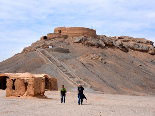 当日伊朗时间09:50,《探秘波斯帝国伊朗奇迹旅行》团队开启亚兹德的行程,来到首个景点:亚兹德古城寂静之塔参观。余粟介绍说,今天探秘的伊朗神秘的亚兹德寂静塔,源自古老的波斯拜火教,与西藏天葬仪式有异曲同工之妙。寂静之塔是拜火教信徒施行鸟葬的地方。