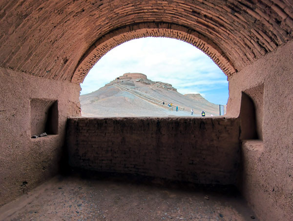 在亚兹德市郊有多座用于天葬的“寂静塔”俗称“天葬塔”,拜火教天葬的习俗沿袭了几千年,直到到 1987 年才被政府叫停。走进寂静塔景区,远远看去两座光秃秃的小山山头上,各有一座像城堡一样的古建筑,那就是“寂静塔”。余粟说,我们正面的塔建于18世纪,左侧高一点的塔建于16世纪。