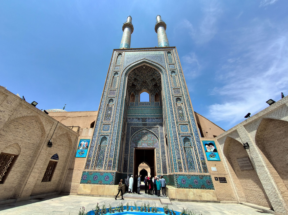 2023.04.28伊朗时间11:10,团队来到亚兹德古城的第二站:聚礼清真寺。余粟说该寺也称“礼拜五清真寺”,它是伊朗现存此类建筑中最古老的一座,也是其后整个中亚地区清真寺设计的原型。